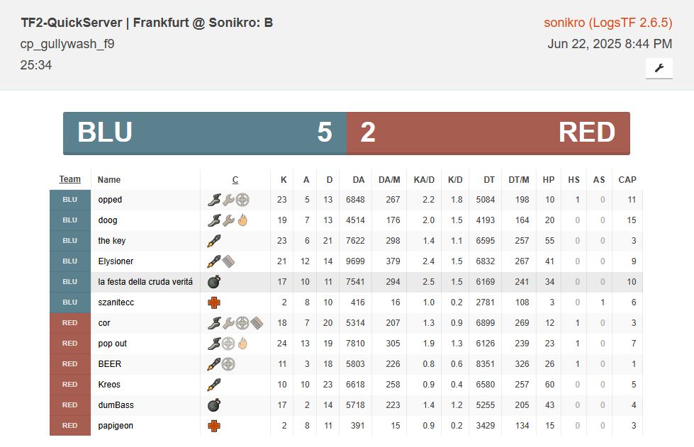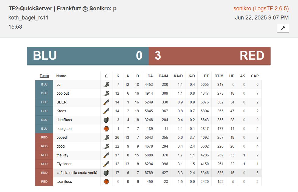 This player played in 34 matches. Played classes: Scout, Medic. Part of the following teams: MACD [4v4], how do i cap? [2v2], GRAPE GAMING ORIGINS [6v6 Fun Team], EPIC TEAM :D [6v6].